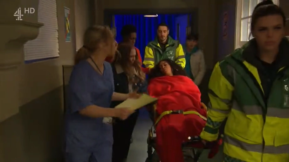 Charlie and Leah panic as Vicky lay unconscious. Darren hears his phone buzzing and finds six missed calls from Charlie. DeMarcus hears Leah shouting for him. Darren can't get ahold of Charlie. Leah tells DeMarcus that Vicky smoked weed and was offered pills. Ste receives a phone call and looks at Leela. Darren kisses Nancy on the cheek as she gives him his coat. DeMarcus holds Vicky as an ambulance arrives. Felix grabs his keys, but Scott - on the phone - stops him as he leaves.